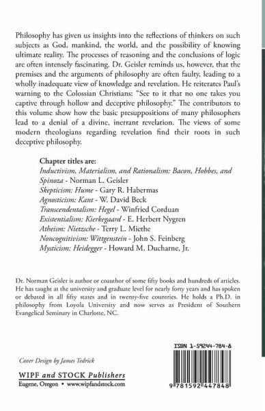 Philosophy has given us insights into the reflections of thinkers on such subjects as God, mankind, the world, and the possibility of knowing ultimate reality. The processes of reasoning and the conclusions of logic are often intensely fascinating. Dr. Geisler reminds us, however, that the premises and the arguments of philosophy are often faulty, leading to a wholly inadequate view of knowledge and revelation. He reiterates Paul's warning to the Colossian Christians: See to it that no one takes you captive through hollow and deceptive philosophy. The contributors to this volume show how the basic presuppositions of many philosophers lead to a denial of a divine, inerrant revelation. The views of some modern theologians regarding revelation find their roots in such deceptive philosophy. Chapter titles are: -'Inductivism, Materialism, and Rationalism: Bacon, Hobbes, and Spinoza' - Norman L. Geisler -'Skepticism: Hume' - Gary R. Habermas -'Agnosticism: Kant' - W. David Beck -'Transcendentalism: Hegel' - Winfried Corduan -'Existentialism: Kierkegaard' - E. Herbert Nygren -'Atheism: Nietzsche' - Terry L. Miethe -'Noncognitivism: Wittgenstein' - John S. Feinberg -'Mysticism: Heidegger' - Howard M. Ducharne, Jr.