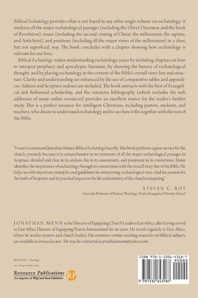 Biblical Eschatology provides what is not found in any other single volume on eschatology: it analyzes all the major eschatological passages (including the Olivet Discourse and the book of Revelation), issues (including the second coming of Christ, the millennium, the rapture, and Antichrist), and positions (including all the major views of the millennium) in a clear, but not superficial, way. The book concludes with a chapter showing how eschatology is relevant for our lives. Biblical Eschatology makes understanding eschatology easier by including chapters on how to interpret prophecy and apocalyptic literature, by showing the history of eschatological thought, and by placing eschatology in the context of the Bible's overall story line and structure. Clarity and understanding are enhanced by the use of comparative tables and appendices. Subject and Scripture indexes are included. The book interacts with the best of Evangelical and Reformed scholarship, and the extensive bibliography (which includes the web addresses of many online resources) provides an excellent source for the reader's further study. This is a perfect resource for intelligent Christians, including pastors, students, and teachers, who desire to understand eschatology and to see how it fits together with the rest of the Bible.