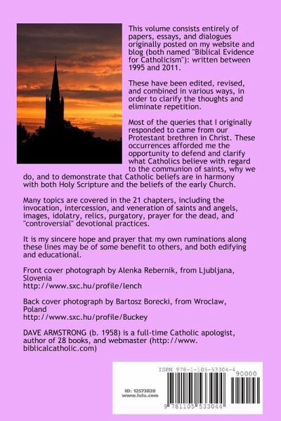 This volume consists entirely of papers, essays, and dialogues originally posted on my website and blog (both named "Biblical Evidence for Catholicism"): written between 1995 and 2011. These have been edited, revised, and combined in various ways, in order to clarify the thoughts and eliminate repetition. Most of the queries that I originally responded to came from our Protestant brethren in Christ. These occurrences afforded me the opportunity to defend and clarify what Catholics believe with regard to the communion of saints, why we do, and to demonstrate that Catholic beliefs are in harmony with Holy Scripture. Many topics are covered in the 21 chapters, including the invocation, intercession, and veneration of saints and angels, images, idolatry, relics, purgatory, prayer for the dead, and "controversial" devotional practices. It is my sincere hope and prayer that my own ruminations along these lines may be of some benefit to others, and both edifying and educational.