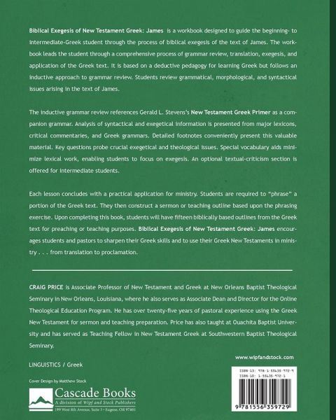 Description: Biblical Exegesis of New Testament Greek: James is a workbook designed to guide the beginning- to intermediate-Greek student through the process of biblical exegesis of the text of James. The workbook leads the student through a comprehensive process of grammar review, translation, exegesis, and application of the Greek text. It is based on a deductive pedagogy for learning Greek but follows an inductive approach to grammar review. Students review grammatical, morphological, and syntactical issues arising in the text of James. The inductive grammar review references Gerald L. Stevens's New Testament Greek Primer as a companion grammar. Analysis of syntactical and exegetical information is presented from major lexicons, critical commentaries, and Greek grammars. Detailed footnotes conveniently present this valuable material. Key questions probe crucial exegetical and theological issues. Special vocabulary aids minimize lexical work, enabling students to focus on exegesis. An optional textual-criticism section is offered for intermediate students. Each lesson concludes with a practical application for ministry. Students are required to ""phrase"" a portion of the Greek text. They then construct a sermon or teaching outline based upon the phrasing exercise. Upon completing this book, students will have fifteen biblically based outlines from the Greek text for preaching or teaching purposes. Biblical Exegesis of New Testament Greek: James encourages students and pastors to sharpen their Greek skills and to use their Greek New Testaments in ministry . . . from translation to proclamation. Endorsements: ""In Biblical Exegesis of New Testament Greek: James, Craig Price provides a clear, accurate, and student-friendly approach to learning New Testament exegesis. Using James as the primary field of study, students plow into grammar, translation, exegesis, phrasing, vocabulary review, and application. This trustworthy guide will equip students to know, use, and love the New Testament at a much deeper level."" --J. Scott Duvall, Professor of New Testament Ouachita Baptist University ""The church is in dire need of pastors who will spend time both exegeting the biblical text and faithfully preaching its content. Craig Price has given pastors and teachers who appreciate the Greek text a tremendously helpful tool-helping them move from the original text to a preaching/teaching outline. Moreover, professors who are looking for a textbook to help Greek students read through James will find this textbook/workbook blend a great pedagogical tool."" --Preben Van Professor & Chair, Department of Biblical and Theological Studies Palm Beach Atlantic University ""This work will serve beginning Greek students extremely well in moving from grammar into the use of Greek for exegesis by way of the direct study of a New Testament book. Besides reinforcing their basic Greek skills through a solid grammar review, students will begin to experience what is so often their major goal for studying Koine Greek: learning how their Greek study directly benefits the exegetical process. This tool will further motivate students to continue in their study of Greek as they see the practical implications for interpreting the New Testament."" --Bill Warren Director of the Center for New Testament Textual Studies New Orleans Baptist Theological Seminary About the Contributor(s): Craig Price is Associate Professor of New Testament and Greek at New Orleans Baptist Theological Seminary in New Orleans, Louisiana, where he also serves as Associate Dean and Director for the Online Theological Education Program. He has over twenty-five years of pastoral experience using the Greek New Testament for sermon and teaching preparation. Price has also taught at Ouachita Baptist University and has served as Teaching Fellow in New Testament Greek at Southwestern Baptist Theological Seminary.