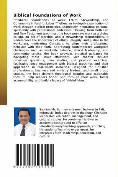 "__Biblical Foundations of Work: Ethics, Stewardship, and Community in Faithful Labor__" offers an in-depth examination of work through biblical principles, seamlessly integrating personal spirituality with professional endeavors. Drawing from both Old and New Testament teachings, the book portrays work as a divine calling, an act of worship, and a stewardship responsibility. It underscores the importance of ethics, integrity, and justice in the workplace, motivating Christians to align their professional behavior with their faith. Addressing contemporary workplace challenges such as work-life balance, ethical leadership, and community service, the book provides practical guidance for navigating these issues effectively. Each chapter includes reflection questions, case studies, and practical exercises, facilitating deep engagement with biblical teachings and their application in real-world scenarios. Designed for Christian professionals, business and ministry leaders, and small group studies, the book delivers theological insights and actionable tools to help readers honor God through their work, foster accountability, and build a legacy of faithful labor.
