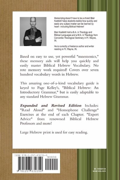 Based on easy to use, yet powerful "mnemonics," these memory aids will help you quickly and easily master Biblical Hebrew Vocabulary. No route memory work required! Covers over 700 hundred vocabulary words in Hebrew. Those mastering the Hebrew vocabulary in this guide will have a recognition rate of over 80% of all word occurrences in the Hebrew text! This amazing one-of-a-kind vocabulary guide is keyed to Page Kelley's, "Biblical Hebrew: An Introductory Grammar" but is easily adaptable to any standard Hebrew grammar. Newly Revised and Expanded Edition includes: "Read Aloud" and "Homophone Challenge" Exercises at the end of each chapter. "Expert Advice" from renowned Hebrew Professors is included and more! Large Hebrew print is used for easy reading.