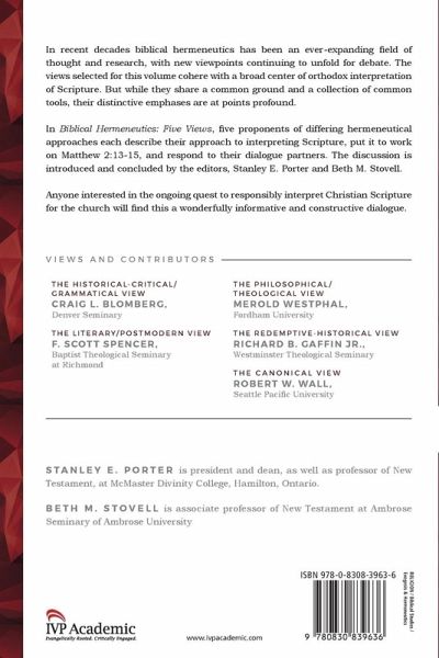 This book presents proponents of five approaches to biblical hermeneutics and allows them to respond to each other. The five approaches are the historical-critical/grammatical (Craig Blomberg), redemptive-historical (Richard Gaffin), literary/postmodern (Scott Spencer), canonical (Robert Wall) and philosophical/theological (Merold Westphal) views.
