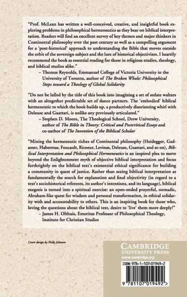 This book applies philosophical hermeneutics to biblical studies. Whereas traditional studies of the Bible limit their analysis to the exploration of the texts' original historical sense, this book discusses how to move beyond these issues to a consideration of biblical texts' existential significance for the present. In response to the rejection of biblical significance in the late nineteenth century and the accompanying crisis of nihilism, B. H. McLean argues that the philosophical thought of Heidegger, Bultmann, Gadamer, Habermas, Ricoeur, Levinas, Deleuze and Guattari provides an alternative to historically oriented approaches to biblical interpretation. He uses basic principles drawn from these philosophers' writings to create a framework for a new 'post-historical' mode of hermeneutic inquiry that transcends the subject-based epistemological structure of historical positivism.