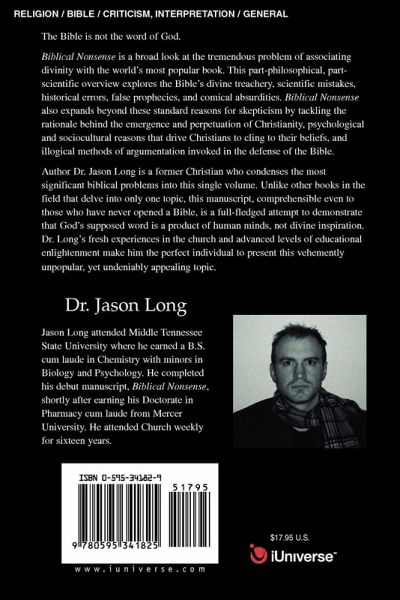 The Bible is not the word of God. Biblical Nonsense is a broad look at the tremendous problem of associating divinity with the world's most popular book. This part-philosophical, part-scientific overview explores the Bible's divine treachery, scientific mistakes, historical errors, false prophecies, and comical absurdities. Biblical Nonsense also expands beyond these standard reasons for skepticism by tackling the rationale behind the emergence and perpetuation of Christianity, psychological and sociocultural reasons that drive Christians to cling to their beliefs, and illogical methods of argumentation invoked in the defense of the Bible. Author Dr. Jason Long is a former Christian who condenses the most significant biblical problems into this single volume. Unlike other books in the field that delve into only one topic, this manuscript, comprehensible even to those who have never opened a Bible, is a full-fledged attempt to demonstrate that God's supposed word is a product of human minds, not divine inspiration. Dr. Long's fresh experiences in the church and advanced levels of educational enlightenment make him the perfect individual to present this vehemently unpopular, yet undeniably appealing topic.