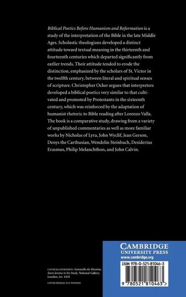 Biblical Poetics before Humanism and Reformation is a study of the interpretation of the Bible in the late Middle Ages. Scholastic theologians developed a distinct attitude toward textual meaning in the thirteenth and fourteenth centuries which departed significantly from earlier trends. Their attitude tended to erode the distinction, emphasized by the scholars of St Victor in the twelfth century, between literal and spiritual senses of scripture. Christopher Ocker argues that interpreters developed a biblical poetics very similar to that cultivated and promoted by Protestants in the sixteenth century, which was reinforced by the adaptation of humanist rhetoric to Bible reading after Lorenzo Valla. The book is a comparative study, drawing from a variety of unpublished commentaries as well as more familiar works by Nicholas of Lyra, John Wyclif, Jean Gerson, Denys the Carthusian, Wendelin Steinbach, Desiderius Erasmus, Philip Melanchthon, and John Calvin.
