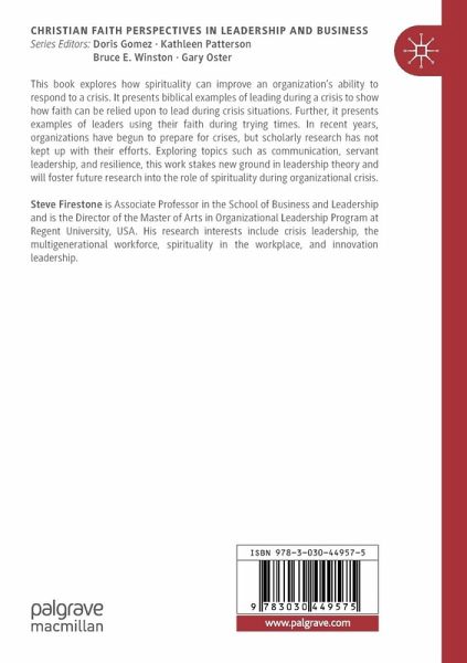 Chapter 1. Introduction.- Chapter 2. What is crisis leadership?.- Chapter 3. Personal crisis and relationship to organizational crisis leadership.- Chapter 4. Difference between Spiritual leadership and spiritual leadership.- Chapter 5. Reasons to rely on Christ during a crisis.- Chapter 6. Importance of communication during a crisis.- Chapter 7. Steps to take during a crisis.- Chapter 8. How Spiritual crisis leadership can help an organization grow.- Chapter 9. Crisis leadership and development of organizational resilience.- Chapter 10. Servant leadership and crisis leadership.- Chapter 11. Conclusion.