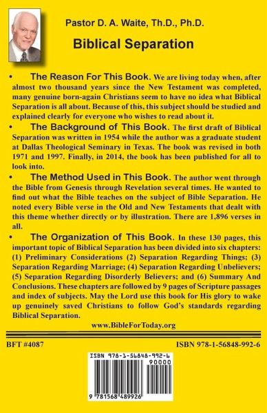 We are living today when, after almost two thousand years since the New Testament was completed, many genuine born-again Christians seem to have no idea what Biblical Separation is all about. Because of this, this subject should be studied and explained clearly for everyone who wishes to read about it. The author noted every Bible verse in the Old and New Testaments that dealt with this theme whether directly or by illustration. There are 1,896 verses in all. This important topic of Biblical Separation has been divided into six chapters: (1) Preliminary Considerations (2) Separation Regarding Things; (3) Separation Regarding Marriage; (4) Separation Regarding Unbelievers; (5) Separation Regarding Disorderly Believers; and (6) Summary And Conclusions. These chapters are followed by 9 pages of Scripture passages and index of subjects.