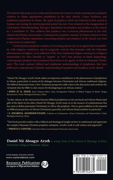 The basis for this project is to verify and determine the extent to which contemporary prophetic ministry in Ghana appropriates prophetism in the early church, Corpus Paulinum, and traditional prophetism in Ghana. The spirit of prophecy which was believed to have ceased in Judaism and during the intertestamental period has now been restored at the inauguration of Christianity. Notwithstanding, Paul gave stipulations for prophets and prophecy in the church in 1 Corinthians 14. This confirms that prophecy was a common phenomenon in the early church and Pauline communities. Contemporary prophetic ministry in Ghana claimed to have conformed to Pauline stipulations concerning prophets and prophecy in the church, but what is their level of conformity? Contemporary prophetic ministry is becoming popular due to its appeal and compatibility with religious worldviews and its pragmatic outlook that resonates with the Ghanaian phenomenon of religion. As an adherent of the Akan traditional religion would go to a religious intermediary for ebisa (literally to ""inquire"" or ""ask"") into present or future happenings, contemporary prophets have positioned themselves to be agents of ebisa in Ghanaian Christianity. This book explores biblical and traditional understandings of prophetism that have influenced contemporary Christian understanding of prophets and prophecy in the church.