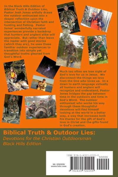 In the Black Hills Edition of Biblical Truth & Outdoor Lies, Pastor Josh Jones artfully draws the outdoor enthusiast into a deeper reflection upon the intersection of Christian faith and hunting and fishing. Pastor Jones' wonderfully narrated experiences provide a backdrop that hunters and anglers alike will appreciate. Rather than leave the reader with good stories (which they are), he uses these familiar outdoor experiences to transition into simple yet thoughtful truths gleaned from God's Word. Much too often we lose sight of God's love for us in Jesus and disconnect the things we love from the One who loves us. In a down to earth language all hunters and anglers will recognize and understand, Jones bridges the gap between time in the outdoors and time in God's Word. The outdoor enthusiast who works through these thoughtful devotions will see the world in a better way that increases both his thanks for the gift of God's love in Christ and the gifts found in God's creation.