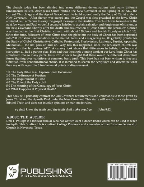 The church today has been divided into many different denominations and many different fundamental beliefs. After Jesus Christ ratified the New Covenant in the Spring of 30 AD., the current Church age and the Age of Grace began to build up and unify the Body of Christ under a New Covenant. After Steven was stoned and the Gospel was first preached to the Jews, Christ anointed Saul of Tarsus to carry the gospel message to the Gentiles. The church was formed over the next few years and Paul wrote 13 separate Epistles to explain salvation and forgiveness of sins under the new Covenant. Shortly after the death and resurrection of Jesus Christ, the Jerusalem Church was founded as the first Christian church with about 120 Jews and Jewish Proselytes (Acts 1:15). Since that time, followers of Jesus Christ span the globe but the body of Christ has been separated into 200 Christian denominations in the United States. and a staggering 45,000 globally (Center for the Study of Global Christianity): Catholic, Pentecostal, Presbyterian, Lutheran, Baptist, Apostolic, Methodist.... the list goes on and on. Why has this happened since the Jerusalem church was founded in the 1st century AD? A cursory look shows that differences in beliefs, theology and corruption all had a part to play. How sad that the single atoning work of our Lord Jesus Christ has splintered into so many parts. Jesus Christ never taught that there would be different denominal forces fighting over variations of common, basic truth. This book has not been written to free any Christian from denominational chains. It is intended to search the scriptures and determine what they say with regard to 6 fundamental points of disagreement. 1.0 The Holy Bible as a Dispensational Document 2.0 The Ordinance of Baptism 3.0 The Requirement to Tithe 4.0 The Role of the Holy spirit 5.0 The Meaning of the Genealogy of Jesus Christ 6.0 What Happens at Physical Death? This book will primarily contrast the Old Covenant requirements and commands to those given by Jesus Christ and the Apostle Paul under the New Covenant. This study will search the scriptures for Biblical Truth and does not involve opinions or man-made rules.