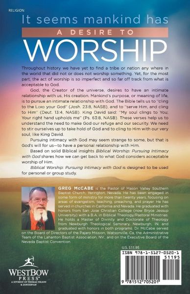 Throughout history we have yet to find a tribe or nation any where in the world that did not or does not worship something. Yet, for the most part, the act of worship is so imperfect and so far off track from what is acceptable to God. God, the Creator of the universe, desires to have an intimate relationship with us, His creation. Mankind's purpose, or meaning of life, is to pursue an intimate relationship with God. The Bible tells us to "cling to the Lord your God" (Josh. 23:8, NASB), and to "serve Him, and cling to Him" (Deut. 13:4, NASB). King David said: "My soul clings to You; Your right hand upholds me" (Ps. 63:8, NASB). These verses help us to understand the need to make God our refuge and our security. We need to stir ourselves up to take hold of God and to cling to Him with our very soul, like King David. Pursuing intimacy with God may seem strange to some, but that is God's will for us-to have a personal relationship with Him. Based on solid Biblical insights Biblical Worship: Pursuing Intimacy with God shares how we can get back to what God considers acceptable worship of Him. Biblical Worship: Pursuing Intimacy with God is designed to be used for personal or group study.