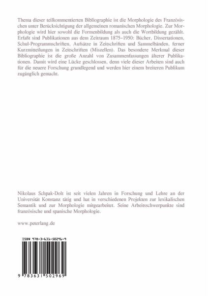 Thema dieser teilkommentierten Bibliographie ist die Morphologie des Französischen unter Berücksichtigung der allgemeinen romanischen Morphologie. Zur Morphologie wird hier sowohl die Formenbildung als auch die Wortbildung gezählt. Erfaßt sind Publikationen aus dem Zeitraum 1875-1950: Bücher, Dissertationen, Schul-Programmschriften, Aufsätze in Zeitschriften und Sammelbänden, ferner Kurzmitteilungen in Zeitschriften (Miszellen). Das besondere Merkmal dieser Bibliographie ist die große Anzahl von Zusammenfassungen älterer Publikationen. Damit wird eine Lücke geschlossen, denn viele dieser Arbeiten sind auch für die neuere Forschung grundlegend und werden hier einem breiteren Publikum zugänglich gemacht.