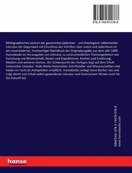 Bibliographisches Lexicon der gesammten jüdischen - und theologisch-rabbinischen Literatur der Gegenwart mit Einschluss der Schriften über Juden und Judenthum ist ein unveränderter, hochwertiger Nachdruck der Originalausgabe aus dem Jahr 1899.