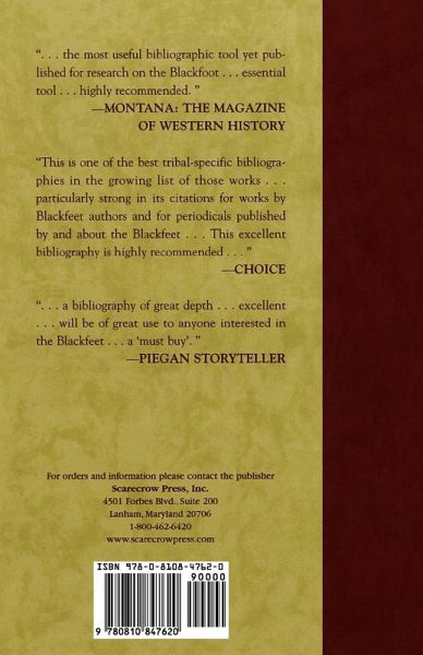 This is one of the best tribal-specific bibliographies in the growing list of those works...particularly strong in its citations for works by Blackfeet authors and for periodicals published by and about the Blackfeet...This excellent bibliography is highly recommended... CHOICE ...a bibliography of great depth...excellent...will be of great use to anyone interested in the Blackfeet...a 'must buy'. Piegan Storyteller ...the most useful bibliographic tool yet published for research on the Blackfoot...essential tool...highly recommended. Montana: The Magazine Of Western History ...highly recommended. Ethnic Forum ...of tremendous help. Prairie Forum ...fortified by indexes by author and general subject. Shenandoah