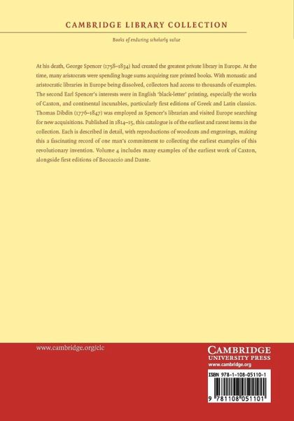 At his death, George Spencer (1758-1834) had created the greatest private library in Europe. At the time, many aristocrats were spending huge sums acquiring rare printed books. With monastic and aristocratic libraries in Europe being dissolved, collectors had access to thousands of examples. The Second Earl Spencer's interests were in English 'black-letter' printing, especially the works of Caxton, and continental incunables, particularly first editions of Greek and Latin classics. Thomas Dibdin (1776-1847) was employed as Spencer's librarian and visited Europe searching for new acquisitions. Published in 1814-15, this catalogue is of the earliest and rarest items in the collection. Each is described in detail, with reproductions of woodcuts and engravings, making this a fascinating record of one man's commitment to collecting the earliest examples of this revolutionary invention. Volume 4 includes many examples of the earliest work of Caxton, alongside first editions of Boccacio and Dante.