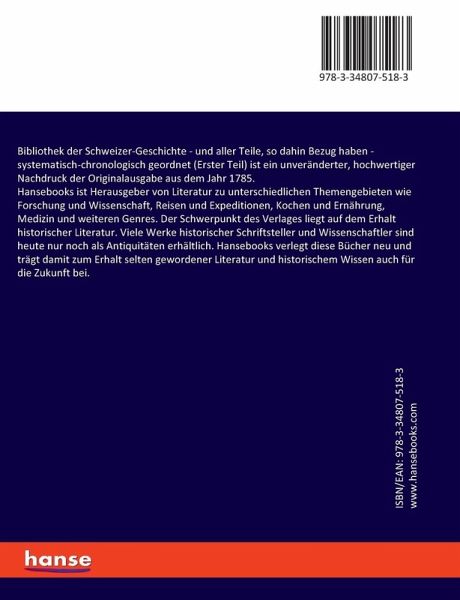 Bibliothek der Schweizer-Geschichte - und aller Teile, so dahin Bezug haben - systematisch-chronologisch geordnet (Erster Teil) ist ein unveränderter, hochwertiger Nachdruck der Originalausgabe aus dem Jahr 1785.Hansebooks ist Herausgeber von Literatur zu unterschiedlichen Themengebieten wie Forschung und Wissenschaft, Reisen und Expeditionen, Kochen und Ernährung, Medizin und weiteren Genres. Der Schwerpunkt des Verlages liegt auf dem Erhalt historischer Literatur. Viele Werke historischer Schriftsteller und Wissenschaftler sind heute nur noch als Antiquitäten erhältlich. Hansebooks verlegt diese Bücher neu und trägt damit zum Erhalt selten gewordener Literatur und historischem Wissen auch für die Zukunft bei.