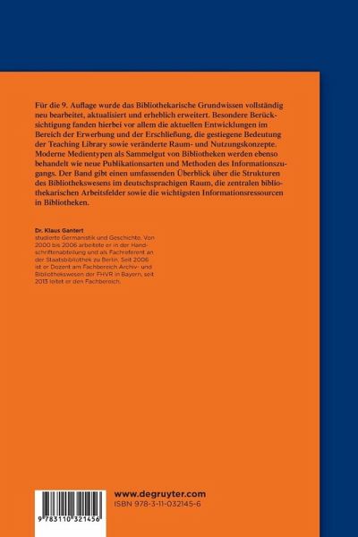 Für die 9. Auflage wurde das Bibliothekarische Grundwissen vollständig neu bearbeitet, aktualisiert und erheblich erweitert. Besondere Berücksichtigung fanden hierbei vor allem die aktuellen Entwicklungen im Bereich der Erwerbung und der Erschließung, die gestiegene Bedeutung der Teaching Library sowie veränderte Raum- und Nutzungskonzepte. Moderne Medientypen als Sammelgut von Bibliotheken werden ebenso behandelt wie neue Publikationsarten und Methoden des Informationszugangs. Der Band gibt einen umfassenden Überblick über die Strukturen des Bibliothekswesens im deutschsprachigen Raum, die zentralen bibliothekarischen Arbeitsfelder sowie die wichtigsten Informationsressourcen in Bibliotheken.