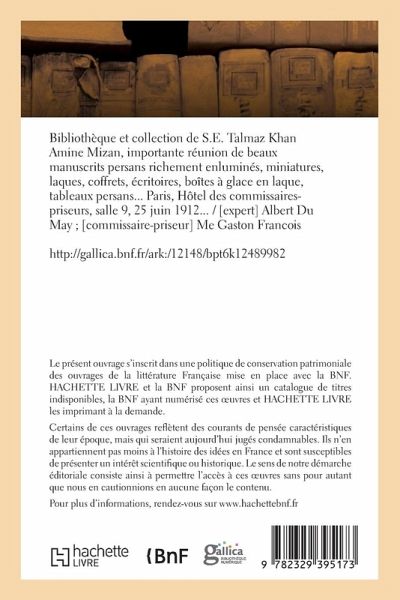 Bibliothèque et collection de S.E. Talmaz Khan Amine Mizan, importante réunion de beaux manuscrits persans richement enluminés, miniatures, laques, coffrets, écritoires, boîtes à glace en laque, tableaux persans... Paris, Hôtel des commissaires-priseurs, salle 9, 25 juin 1912... / [expert] Albert Du May; [commissaire-priseur] Me Gaston Francois Date de l'édition originale: 1912 Le présent ouvrage s'inscrit dans une politique de conservation patrimoniale des ouvrages de la littérature Française mise en place avec la BNF. HACHETTE LIVRE et la BNF proposent ainsi un catalogue de titres indisponibles, la BNF ayant numérisé ces oeuvres et HACHETTE LIVRE les imprimant à la demande. Certains de ces ouvrages reflètent des courants de pensée caractéristiques de leur époque, mais qui seraient aujourd'hui jugés condamnables. Ils n'en appartiennent pas moins à l'histoire des idées en France et sont susceptibles de présenter un intérêt scientifique ou historique. Le sens de notre démarche éditoriale consiste ainsi à permettre l'accès à ces oeuvres sans pour autant que nous en cautionnions en aucune façon le contenu. Pour plus d'informations, rendez-vous sur www.hachettebnf.fr