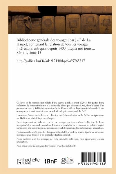 Bibliothèque générale des voyages [par J.-F. de La Harpe], contenant la relation de tous les voyages intéressans entrepris depuis 1400 jusqu'à nos jours.... Série 1, Tome 15 Date de l'édition originale: 1829-1830 Le présent ouvrage s'inscrit dans une politique de conservation patrimoniale des ouvrages de la littérature Française mise en place avec la BNF. HACHETTE LIVRE et la BNF proposent ainsi un catalogue de titres indisponibles, la BNF ayant numérisé ces oeuvres et HACHETTE LIVRE les imprimant à la demande. Certains de ces ouvrages reflètent des courants de pensée caractéristiques de leur époque, mais qui seraient aujourd'hui jugés condamnables. Ils n'en appartiennent pas moins à l'histoire des idées en France et sont susceptibles de présenter un intérêt scientifique ou historique. Le sens de notre démarche éditoriale consiste ainsi à permettre l'accès à ces oeuvres sans pour autant que nous en cautionnions en aucune façon le contenu. Pour plus d'informations, rendez-vous sur www.hachettebnf.fr