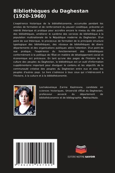 L'expérience historique de la bibliothéconomie, accumulée pendant les années de formation et de renforcement du pouvoir soviétique, présente un intérêt théorique et pratique pour accroître encore le niveau du rôle public des bibliothèques, améliorer le système des services de bibliothèque à la population multinationale de la République moderne du Daghestan. D'un point de vue théorique, le processus de formation de la principale structure typologique des bibliothèques, des réseaux de bibliothèques de divers départements et des organisations publiques attire l'attention. D'un point de vue pratique, l'expérience du fonctionnement des bibliothèques conformément à la politique de l'État en matière de développement social et économique est précieuse. En tant qu'une des pages de l'histoire de la culture des peuples du Daghestan, la bibliothèque est un outil d'information supplémentaire important pour divulguer le contenu et les objectifs de la communauté créative des peuples du Daghestan entre eux et avec les peuples d'autres pays. Le livre s'adresse à tous ceux qui s'intéressent à l'histoire, à la culture et à la bibliothéconomie.