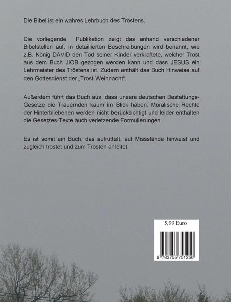 Die Bibel ist ein wahres Lehrbuch des Tröstens.Die vorliegende Publikation zeigt das anhand verschiedener Bibelstellen auf. In detaillierten Beschreibungen wird benannt, wie z.B. König DAVID den Tod seiner Kinder verkraftete, welcher Trost aus dem Buch JIOB gezogen werden kann und dass JESUS ein Lehrmeister des Tröstens ist. Zudem enthält das Buch Hinweise auf den Gottesdienst der Trost-Weihnacht.Außerdem führt das Buch aus, dass unsere deutschen Bestattungs-Gesetze die Trauernden kaum im Blick haben. Moralische Rechte der Hinterbliebenen werden nicht berücksichtigt und leider enthalten die Gesetzes-Texte auch verletzende Formulierungen.Es ist somit ein Buch, das aufrüttelt, auf Missstände hinweist und zugleich tröstet und zum Trösten anleitet.