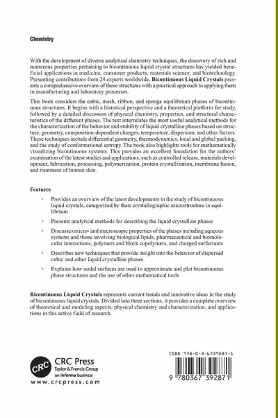 This book examines the latest studies of bicontinuous liquid crystal structures with a practical approach to applications - such as controlled release, materials development, fabrication, processing, polymerization, protein crystallization, membrane fusion, and treatment of human skin - in manufacturing and laboratory processes. The book covers the cubic, mesh, ribbon, and sponge equilibrium phases of bicontinuous structures. It offers a historical perspective and a theoretical platform for study, a detailed discussion of properties and phase applications, and methods for describing the liquid crystalline phases, such as differential geometry, thermodynamics, local and global packing, and the study of conformational entropy. The book also highlights tools for visualizing bicontinuous systems mathematically.