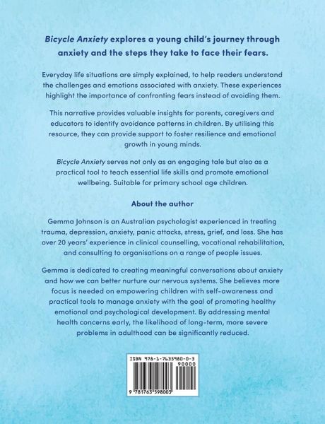 Bicycle Anxiety explores a young child's journey through anxiety and the steps they take to face their fears. Everyday life situations are simply explained, to help readers understand the challenges and emotions associated with anxiety. These experiences highlight the importance of confronting fears instead of avoiding them. This narrative provides valuable insights for parents, caregivers and educators to identify avoidance patterns in children. By utilising this resource, they can provide support to foster resilience and emotional growth in young minds. Bicycle Anxiety serves not only as an engaging tale but also as a practical tool to teach essential life skills and promote emotional wellbeing. Suitable for primary school age children.