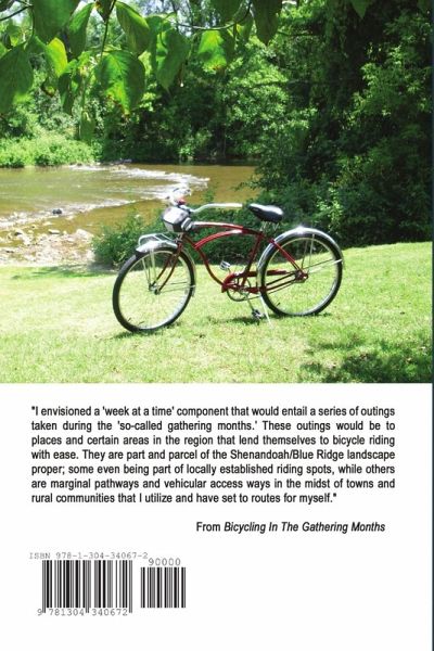Bicycle riding for the casual rider, or even the ardent cyclist. Inspired after giving a 1959 Schwinn bicycle cruiser, which he had purchased and restored, the name "Huckleberry Schwinn" the author rides on easy routes he has set for himself in small towns and the countryside about Virginia's southern Shenandoah Valley during its summer season. Written to give readers all the information needed to ride the routes, too. "Bicycling In The Gathering Months" is a great blueprint for a light summertime bicycling adventure. Or, simply enjoyable bicycle riding anytime and, of course, on the bicycle of choice.