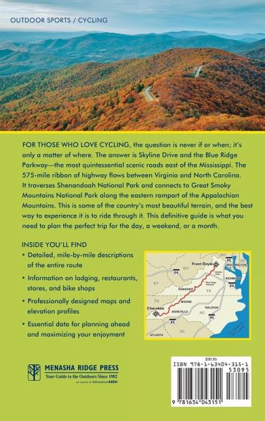 Acknowledgments Preface Part 1: An Introduction to Bicycling the Blue Ridge * The Ultimate Bicycling Road * Weather in the Blue Ridge Mountains * Camping versus Lodging * Gearing Up: Special Equipment and Clothing Part 2: Point-by-Point Descriptions 1. An Explanation of Our Point-by-Point Descriptions 2. The Skyline Drive * Front Royal to Thornton Gap * Thornton Gap to Swift Run Gap * Swift Run Gap to Rockfish Gap 3. The Blue Ridge Parkway * Rockfish Gap to James River Visitor Center * James River Visitor Center to Roanoke Mountain * Roanoke Mountain to Mabry Mill * Mabry Mill to Cumberland Knob * Cumberland Knob to Northwest Trading Post * Northwest Trading Post to Linville Falls * Linville Falls to Craggy Gardens * Craggy Gardens to Mount Pisgah * Mount Pisgah to Cherokee * Great Smoky Mountains National Park Part 3: Appendices * Appendix A: Bicycle Shops * Appendix B: For More Information * Appendix C: Major Elevation Gains Index