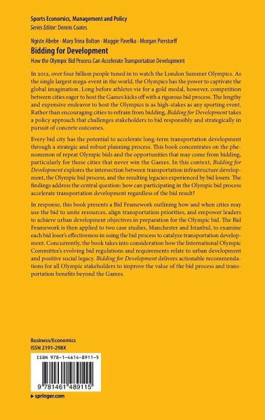 Every bid city has the potential to accelerate long-term transportation development through a strategic and robust planning process. This book concentrates on the phenomenon of repeat Olympic bids and the opportunities that may come from bidding, particularly for those cities that never win the Games. In this context, Bidding for Development explores the intersection between transportation infrastructure development, the Olympic bid process, and the resulting legacies experienced by bid losers. The findings address the central question: how can participating in the Olympic bid process accelerate transportation development regardless of the bid result?