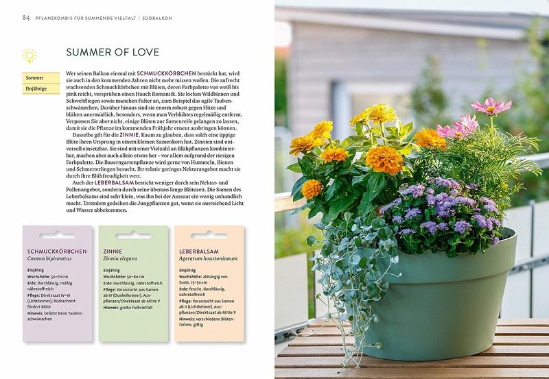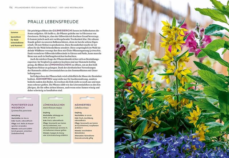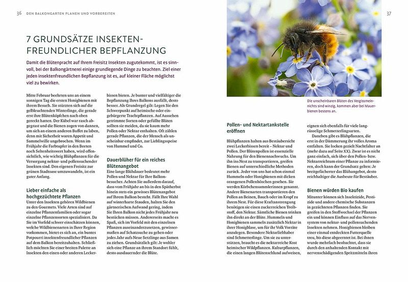 Machen Sie Ihren Balkon zum blütenreichen Insekten-Biotop. Das gelingt auch Anfängern ohne grünen Daumen mit einer insektenfreundlichen Bepflanzung nach sieben Grundsätzen. Mit 20 Pflanzenkombinationen aus leicht erhältlichen Balkonpflanzen können Sie ganz unkompliziert sofort loslegen. Tipps zur Pflanzung und Pflege helfen Ihnen dabei. Die tierischen Nektarfans und Pollensucher lernen Sie in kurzen Porträts kennen, ebenso einfache Nisthilfen zum Nachbauen. So lässt sich der Balkon locker in ein blühendes Insektenparadies verwandeln!