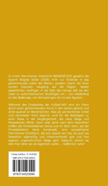 In ihrem Mannheimer Imkerkrimi "Bienenstich" gewährt die Autorin Brigitte Stolle (1959) nicht nur Einblicke in das geheimnisvolle Leben der Bienen, sondern macht mit ihren bunten Exkursen neugierig auf die Region. Neben appetitlichen Ausflügen in die Welt des Honigs lädt sie den Leser zu vielseitigen kulturhistorischen Streifzügen ein - von Heidelberg an den Bodensee, von Schwetzingen bis ins alte Ägypten.Während des Finalspieles der Fußball-WM wird ein Mann durch einen geheimnisvollen Anruf in den Garten gelockt und stirbt qualvoll an Bienenstichen. Was als vermeintlicher Unfall und vermuteter Mord beginnt, wird für die Beteiligten zu einer Reise in die Vergangenheit, die neue Wege und Perspektiven öffnet. Denn zwei Jahre nach dem Geschehen treffen die Hinterbliebenen Almut und ihr Sohn Henri auf die Privatdetektivin Karla Kunstwadl, eine sympathische Mannheimer Ermittlerin, die sich sowohl als Frau als auch als Detektivin eigenwillig und unkonventionell gibt und ihre eigenen ungewöhnlichen Wege geht. Dadurch kommt sie dem Fall näher als sie eigentlich wollte ... Gefährlich nahe!(2. überarbeitete Auflage)