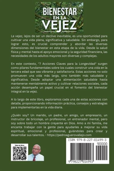 Bienestar en la Vejez: Abordando Necesidades y Prioridades en la Tercera Edad. 7 Acciones Claves para la Longevidad. En el transcurso de la vida, cada etapa nos presenta desafíos únicos, oportunidades para crecer y momentos para reflexionar. Sin embargo, la vejez, una fase a menudo mal comprendida, representa un periodo esencial y digno de atención especial de nuestra vida. En este libro, "Bienestar en la Vejez, exploramos con detenimiento la importancia del bienestar en la vejez y cómo podemos abordar sus necesidades y prioridades de manera efectiva. La vejez, lejos de ser un declive inevitable, es una oportunidad para cultivar una vida plena, significativa y saludable. Sin embargo, para lograr esto, es crucial comprender y abordar las diversas dimensiones del bienestar en esta etapa de la vida. Desde la salud física y mental hasta el apoyo emocional y la seguridad financiera, las necesidades de los adultos mayores son diversas y complejas. En este contexto, "7 Acciones Claves para la Longevidad" surgen como pilares fundamentales sobre los cuales construir una vida en la tercera edad que sea vibrante y satisfactoria. Estas acciones no solo promueven una vida más larga, sino también más saludable y significativa. Desde adoptar una alimentación saludable hasta mantenerse mentalmente activo y cultivar relaciones sociales, cada acción desempeña un papel crucial en el fomento del bienestar integral en la vejez. A lo largo de este libro, exploramos cada una de estas acciones con detalle, proporcionando información práctica, consejos y estrategias para implementarlas en la vida diaria. Además, examinaremos las necesidades y prioridades específicas de los adultos mayores, desde el acceso a la atención médica hasta la planificación financiera y el sentido de propósito. En última instancia, este libro tiene como objetivo brindar un recurso integral para aquellos que buscan no solo sobrevivir, sino prosperar en la tercera edad. Al abordar las necesidades y prioridades de los adultos mayores y al ofrecer herramientas prácticas para promover su bienestar, esperamos inspirar y empoderar a los lectores a vivir una vida en la vejez que esté llena de vitalidad, propósito y felicidad.