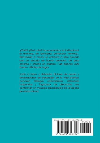 ¿Crisis? ¿Qué crisis? La económica, la institucional, la amorosa, de identidad, existencial, nerviosa... Bienvenido a menos se enfrenta a ellas armado con un escudo de humor corrosivo, de poso amargo y servido en píldoras -de apenas unas líneas- difíciles de tragar. Junto a falsos y delirantes titulares de prensa y declaraciones de personajes de la vida pública, conviven diálogos costumbristas, reflexiones indignadas y fogonazos de alienación que conforman un mosaico esperpéntico de la España de ahora mismo.