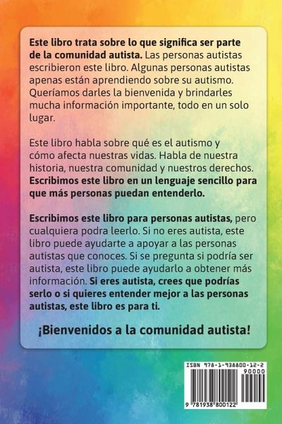 Este libro trata sobre lo que significa ser parte de la comunidad autista. Las personas autistas escribieron este libro. Algunas personas autistas apenas están aprendiendo sobre su autismo. Queríamos darles la bienvenida y brindarles mucha información importante, todo en un solo lugar. Este libro habla sobre qué es el autismo y cómo afecta nuestras vidas. Habla de nuestra historia, nuestra comunidad y nuestros derechos. Escribimos este libro en un lenguaje sencillo para que más personas puedan entenderlo. Escribimos este libro para personas autistas, pero cualquiera podra leerlo. Si no eres autista, este libro puede ayudarte a apoyar a las personas autistas que conoces. Si se pregunta si podría ser autista, este libro puede ayudarlo a obtener más información. Si eres autista, crees que podrías serlo o si quieres entender mejor a las personas autistas, este libro es para ti. ¡Bienvenidos a la comunidad autista!