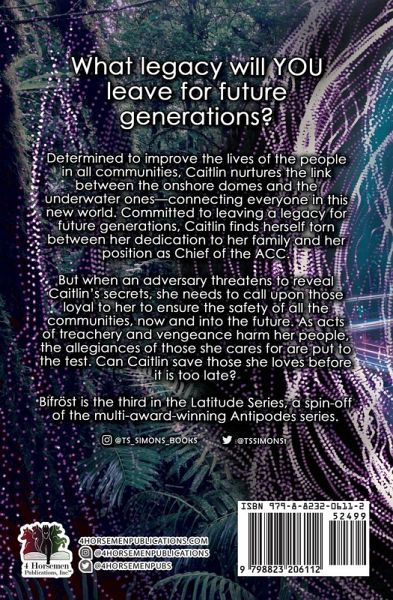 What legacy will YOU leave for future generations? Determined to improve the lives of the people in all communities, Caitlin nurtures the link between the onshore domes and the underwater ones--connecting everyone in this new world. Committed to leaving a legacy for future generations, Caitlin finds herself torn between her dedication to her family and her position as Chief of the ACC. But when an adversary threatens to reveal Caitlin's secrets, she needs to call upon those loyal to her to ensure the safety of all the communities, now and into the future. As acts of treachery and vengeance harm her people, the allegiances of those she cares for are put to the test. Can Caitlin save those she loves before it is too late? Bifröst is the third in the Latitude Series, a spin-off of the multi-award-winning Antipodes series.