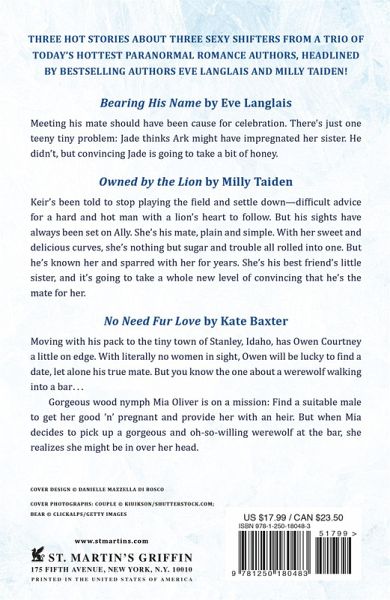 Three hot stories about three sexy shifters from a trio of today's hottest paranormal romance authors, headlined by bestselling authors Eve Langlais and Milly Taiden! Bearing His Name Meeting his mate should have been cause for celebration. There's just one teeny tiny problem. Jade thinks Ark might have impregnated her sister. He didn't, but convincing Jade is going to take a bit of honey. Owned by the Lion Keir's been told to stop playing the field and settle down-difficult advice for a hard and hot man with a lion's heart to follow. But his sights have always been set on Ally. She's his mate, plain and simple. With her sweet and delicious curves, she's nothing but sugar and trouble all rolled into one. But he's known her and sparred with her for years. She's his best friend's little sister, and it's going to take a whole new level of convincing that he's the mate for her. No Need Fur Love Moving with his pack to the tiny town of Stanley, Idaho has Owen Courtney a little on edge. With literally no women in sight, Owen will be lucky to find a date, let alone his true mate. But you know the saying about a werewolf walking into a bar... Gorgeous wood nymph Mia Oliver is on a mission: Find a suitable male to get her good 'n pregnant and provide her with an heir. But when Mia decides to pick up a gorgeous and oh-so willing werewolf at the bar, she realizes she might be in over her head. ...