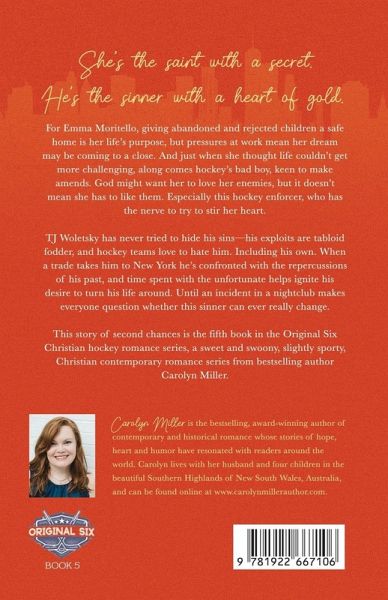 For Emma Moritello, giving abandoned and rejected children a safe home is her life's purpose, but pressures at work means her dream may be coming to a close. And just when she thought life couldn't get more challenging, along comes hockey's bad boy, keen to make amends. God might want her to love her enemies, but it doesn't mean she has to like them. Especially this hockey enforcer, who has the nerve to try to stir her heart. TJ Woletsky has never tried to hide his sins-his exploits are tabloid fodder, and hockey teams love to hate him. Including his own. When a trade takes him to New York he's confronted with the repercussions of his past, and time spent with the unfortunate helps ignite his desire to turn his life around. Until an incident in a nightclub makes everyone question whether this sinner can ever really change. This story of second chances is the fifth book in the Original Six Christian hockey romance series, a sweet and swoony, slightly sporty, clean and wholesome, Christian contemporary romance series from bestselling author Carolyn Miller.