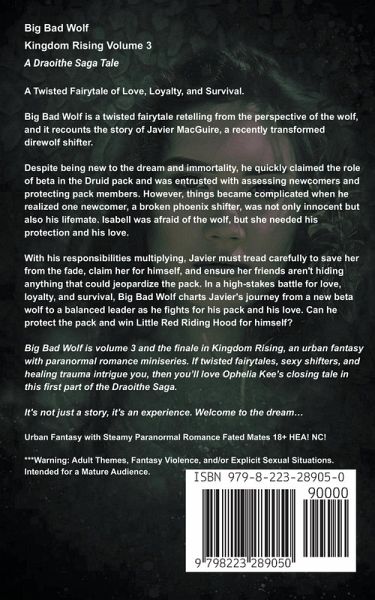 Big Bad Wolf Kingdom Rising Volume 3 A Draoithe Saga Tale Big Bad Wolf is a twisted fairytale retelling from the perspective of the wolf, and it recounts the story of Javier MacGuire, a recently transformed direwolf shifter. Despite being new to the dream and immortality, he quickly claimed the role of beta in the Druid pack and was entrusted with assessing newcomers and protecting pack members. However, things became complicated when he realized one newcomer, a broken phoenix shifter, was not only innocent but also his lifemate. Isabell was afraid of the wolf, but she needed his protection and his love. With his responsibilities multiplying, Javier must tread carefully to save her from the fade, claim her for himself, and ensure her friends aren't hiding anything that could jeopardize the pack. In a high-stakes battle for love, loyalty, and survival, Big Bad Wolf charts Javier's journey from a new beta wolf to a balanced leader as he fights for his pack and his love. Can he protect the pack and win Little Red Riding Hood for himself? Big Bad Wolf is volume 3 and the finale in Kingdom Rising, an urban fantasy with paranormal romance miniseries. If twisted fairytales, sexy shifters, and healing trauma intrigue you, then you'll love Ophelia Kee's closing tale in this first part of the Draoithe Saga. Urban Fantasy with Steamy Paranormal Romance Fated Mates 18+ HEA! NC! ***Warning: Adult Themes, Fantasy Violence, and/or Explicit Sexual Situations. Intended for a Mature Audience.