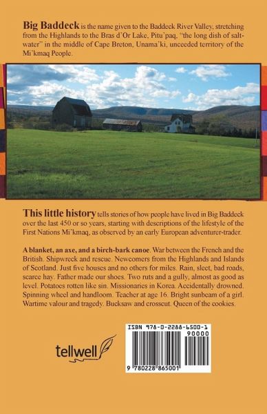Big Baddeck is the name given to the Baddeck River Valley, stretching from the Highlands to the Bras d'Or Lake, Pitu'paq, "the long dish of salt-water" in the middle of Cape Breton, Unama'ki, unceeded territory of the Mi'kmaq People. This little history tells stories of how people have lived in Big Baddeck over the last 450 or so years, starting with descriptions of the lifestyle of the First Nations Mi'kmaq, as observed by an early European adventurer-trader. A blanket, an axe, and a birch-bark canoe. War between the French and the British. Shipwreck and rescue. Newcomers from the Highlands and Islands of Scotland. Just five houses and no others for miles. Rain, sleet, bad roads, scarce hay. Father made our shoes. Two ruts and a gully, almost as good as level. Potatoes rotten like sin. Missionaries in Korea. Accidentally drowned. Spinning wheel and handloom. Teacher at age 16. Bright sunbeam of a girl. Wartime valour and tragedy. Bucksaw and crosscut. Queen of the cookies.