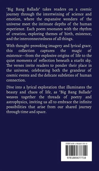 "Big Bang Ballads" takes readers on a cosmic journey through the intertwining of science and emotion, where the expansive wonders of the universe meet the intimate depths of the human experience. Each poem resonates with the rhythm of creation, exploring themes of birth, existence, and the interconnectedness of all things. With thought-provoking imagery and lyrical grace, this collection captures the magic of existence-from the explosive origins of life to the quiet moments of reflection beneath a starlit sky. The verses invite readers to ponder their place in the universe, celebrating both the grandeur of cosmic events and the delicate subtleties of human connection. Dive into a lyrical exploration that illuminates the beauty and chaos of life, as "Big Bang Ballads" weaves together the threads of poetry and astrophysics, inviting us all to embrace the infinite possibilities that arise from our shared journey through time and space.