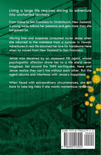 Living a large life requires daring to adventure into uncharted territory. From Dallas to San Francisco to Christchurch, New Zealand, a young nurse follows her passions and gets more than she bargained for. Alluring love and suspense consumed nurse Jenae when she returned to the mainland from a summer in Hawaii. Adventures in real life bloomed her love for handsome Neve when he moved from New Zealand to San Francisco. Jenae was deceived by an obsessed FBI agent, whose psychopathic affection drove her to a life she'd never imagined. Set around the 1989 earthquake, Neve and Jenae realize they can't live without each other. But the agent returns and interferes with Jenae's happiness. When faced with extraordinary circumstances, she will have to take big risks if she wants momentous rewards. The second book in Reggie Brick's Nurse Jenae saga unveils real life events with fictional apprehension and intrigue. #love #romance #sanfrancisco #earthquake #stalker #FBI #NewZealand #Dallas #nurse #hospital #medical #roadtrip #MBA #university #medicalcenter #lambing #farm #aviator #south island #Christchurch #ferry #Seattle #danger #suspense