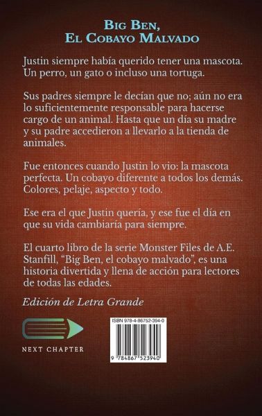 Justin siempre había querido tener una mascota. Un perro, un gato o incluso una tortuga. Sus padres siempre le decían que no; aún no era lo suficientemente responsable para hacerse cargo de un animal. Hasta que un día su madre y su padre accedieron a llevarlo a la tienda de animales. Fue entonces cuando Justin lo vio: la mascota perfecta. Un cobayo diferente a todos los demás. Colores, pelaje, aspecto y todo. Ese era el que Justin quería, y ese fue el día en que su vida cambiaría para siempre. El cuarto libro de la serie Monster Files de A.E. Stanfill, "Big Ben, el cobayo malvado", es una historia divertida y llena de acción para lectores de todas las edades. Edición de Letra Grande
