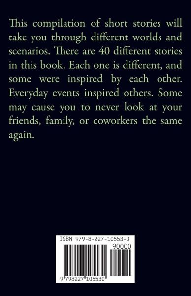 This compilation of short stories will take you through different worlds and scenarios. There are 40 different stories in this book. Each one is different, and some were inspired by each other. Everyday events inspired others. Some may cause you to never look at your friends, family, or coworkers the same again.
