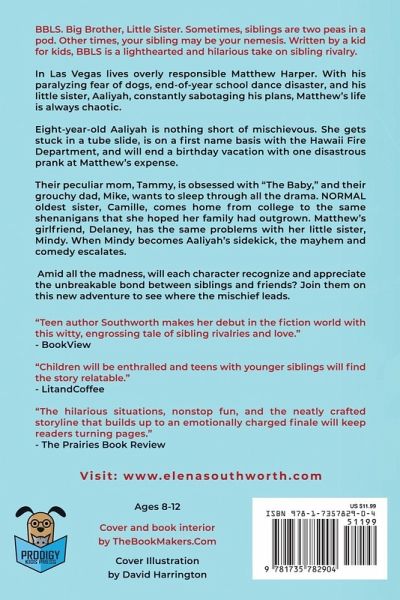 BBLS. Big Brother, Little Sister. Sometimes, siblings are two peas in a pod. Other times, your sibling may be your nemesis. Written by a kid for kids, BBLS is a lighthearted and hilarious take on sibling rivalry. In Las Vegas lives overly responsible seventeen-year-old Matthew Harper. With his paralyzing fear of dogs, end-of-year dance debacle, and his little sister Aaliyah constantly sabotaging his plans, Matthew's life is always chaotic. Eight-year-old Aaliyah is nothing short of mischievous. She gets stuck in a tube slide, is on a first name basis with the Hawaii Fire Department, and will end a birthday vacation with one disastrous prank at Matthew's expense. Their peculiar mom, Tammy, is obsessed with "The Baby," and their grouchy dad, Mike, wants to sleep through all the drama. NORMAL oldest sister, Camille, comes home from college to the same shenanigans that she hoped her family had outgrown. Matthew's girlfriend, Delaney, has the same problems with her little sister, Mindy. When Mindy becomes Aaliyah's sidekick, the mayhem and comedy escalates. Amid all the madness, will each character recognize and appreciate the unbreakable bond between siblings and friends? Join them on this new adventure to see where the mischief leads!