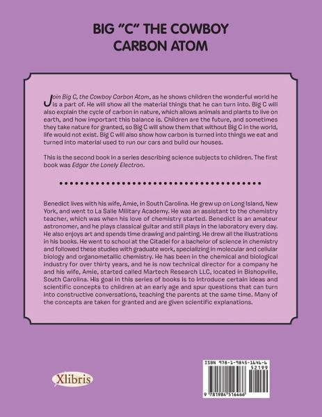Big C, the Cowboy Carbon Atom Join Big C, the Cowboy Carbon Atom, as he shows children the wonderful world he is a part of. He will show all the material things that he can turn into. Big C will also explain the cycle of carbon in nature, which allows animals and plants to live on earth, and how important this balance is. Children are the future, and sometimes they take nature for granted, so Big C will show them that without Big C in the world, life would not exist. Big C will also show how carbon is turned into things we eat and turned into material used to run our cars and build our houses. This is the second book in a series describing science subjects to children. The first book was Edgar the Lonely Electron.