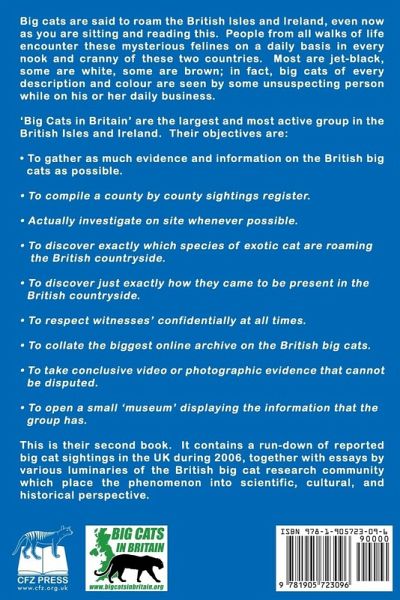 Big cats are said to roam the British Isles and Ireland even now as you are sitting and reading this. People from all walks of life encounter these mysterious felines on a daily basis in every nook and cranny of these two countries. Most are jet-black, some are white, some are brown, in fact big cats of every description and colour are seen by some unsuspecting person while on his or her daily business. 'Big Cats in Britain' are the largest and most active group in the British Isles and Ireland This is their first book. It contains a run-down of every known big cat sighting in the UK during 2006, together with essays by various luminaries of the British big cat research community which place the phenomenon into scientific, cultural, and historical perspective.