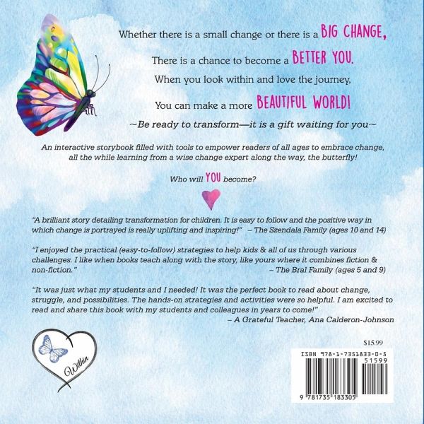 2021 NIEA AWARD FINALIST: Children's Inspirational/Motivational Category 2021 IAN AWARD FINALIST: Children's/Juvenile Fiction Category An interactive storybook filled with tools to empower readers of all ages to embrace change, all while learning from a wise change expert along the way, the butterfly! Who will you become? Whether there is a small change or there is a Big Change,There is a chance to become a Better You.When you look within and love the journey,You can make a more Beautiful World!~Be ready to transform-it is a gift waiting for you~ Change is happening all around us, all the time. Change can be hard, yet so beautiful! Readers learn tools to support them through changes that life may bring (especially world changes, like COVID-19). The charming, wise change expert, the butterfly, engages the reader to become their best self during the change process. Helpful strategies and talking points for families and educators are included. Big Change, Better You, Beautiful World is also available in Spanish: Gran cambio, mejor corazón, mundo hermoso For more connected activities, mindfulness tools, and social-emotional learning skills visit: www.TheButterflyWithin.Me