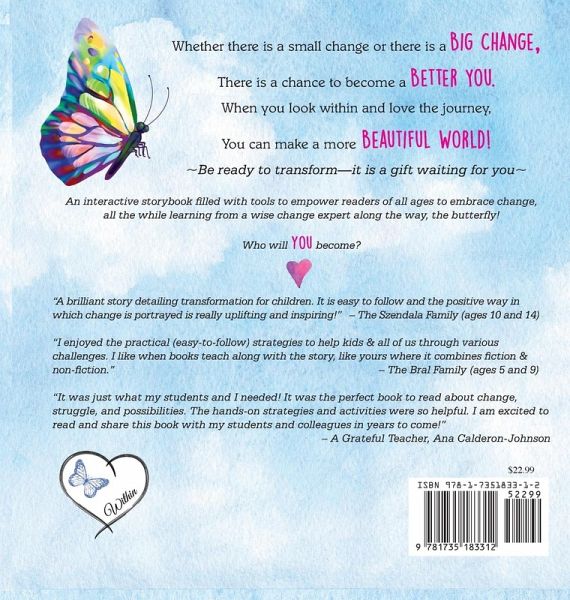 2021 NIEA AWARD FINALIST: Children's Inspirational/Motivational Category 2021 IAN AWARD FINALIST: Children's/Juvenile Fiction Category An interactive storybook filled with tools to empower readers of all ages to embrace change, all while learning from a wise change expert along the way, the butterfly! Who will you become? Whether there is a small change or there is a Big Change,There is a chance to become a Better You.When you look within and love the journey,You can make a more Beautiful World!~Be ready to transform-it is a gift waiting for you~ Change is happening all around us, all the time. Change can be hard, yet so beautiful! Readers learn tools to support them through changes that life may bring (especially world changes, like COVID-19). The charming, wise change expert, the butterfly, engages the reader to become their best self during the change process. Helpful strategies and talking points for families and educators are included. Big Change, Better You, Beautiful World is also available in Spanish: Gran cambio, mejor corazón, mundo hermoso For more connected activities, mindfulness tools, and social-emotional learning skills visit: www.TheButterflyWithin.Me